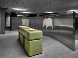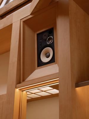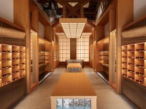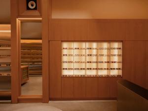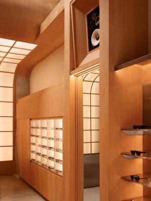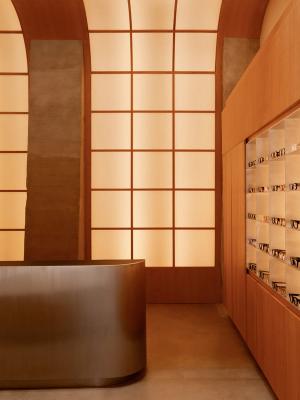 Evoking modern sensibilities and precision in an ode to traditional architecture and design, the AKILA LA storefront was informed by travels to Japan. Inspired by Japanese craftsmanship and traditional ryokans, the design incorporates translucent materials, grids and a curved soffit that echoes shoji sliding doors. The original vaulted ceiling remains a focal point, enhanced by a large cross truss that lowers lighting and exposes the structure. Custom-built pendant lights and glass block display units showcase AKILA’s merchandise against walls lined with Douglas fir woodwork from the Pacific Coast. The space is further enriched with metal shelving, a concrete bench and vintage JBL speakers housed in custom casings. Los Angeles, 2024